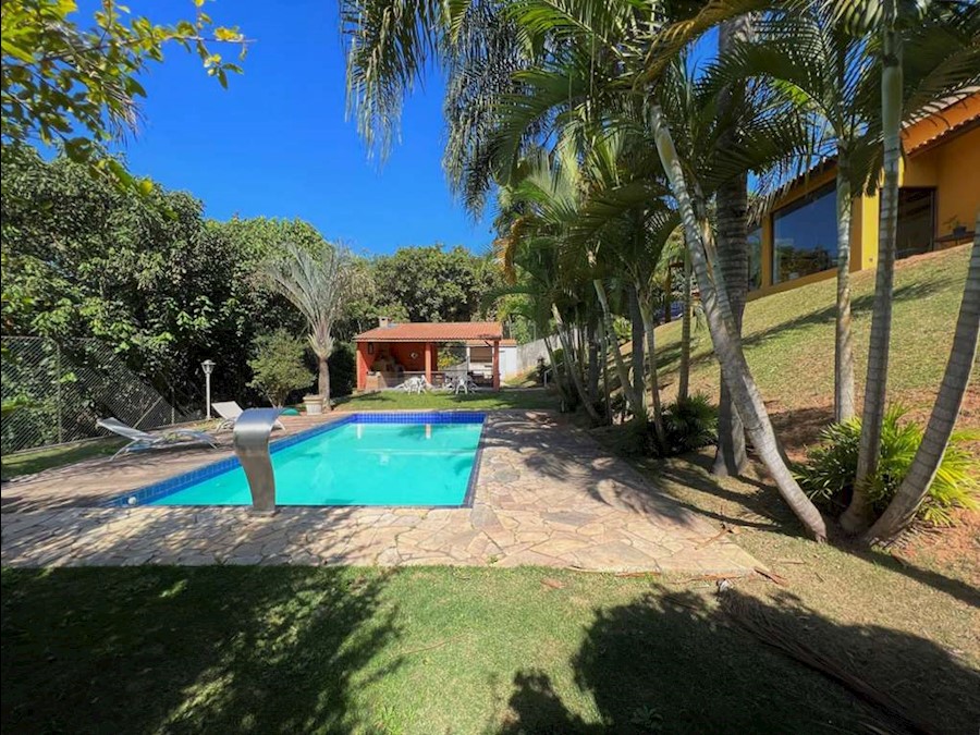 Ótima casa totalmente mobiliada, com muita natureza e privacidade. Imóvel repleto de armários. Portas e janelas externas de ferro, vidro e grades e de madeira e vidro, com veneziana nos quartos. Portas internas almofadadas. Pisos em porcelanato, madeira, vinílico, cerâmica, antiderrapante e Miracema no quintal. Louças e metais de qualidade. Jardim formado. Espaço campinho gramado. Espaço canil. Sistema de câmeras de segurança. Energia trifásica. 3 acessos: social, garagem / lazer e serviço. Hall de entrada social por uma porta dupla de ferro e vidro. Hall íntimo com claraboia e roupeiro (armários, gabinetes e estante). 3 suítes com armários e grande terraço com vista para natureza. A master com sala íntima e grande closet planejado. Banheiros com espelhos, gabinetes e box, sendo a máster com 2 cubas, bidê e hidro. Banheira. Lavabo com espelho e tampo em madeira. Escada (7 degraus) para o mezanino revestida de madeira com guarda corpo de madeira. Living para 8 ambientes em 3 alas com desníveis, voltados para varanda gourmet, terraço e quintal com lazer e jardim. ALA 1 – 2 ambientes: Estar e lareira em parede de pedras. ALA 2 – 2 ambientes: Family room no mezanino, ideal para home theater / home office. Estante de marcenaria com gavetas e terraço. ALA 3 – 4 ambientes: Bar com balcão e prateleiras, adega, jantar / almoço com grande armário e cozinha planejada com gabinetes bancada em “L”, 2 cubas inox, fogão 5 bocas, forno e micro. Tudo integrado à varanda gourmet. Varanda Gourmet Festas integrada (100 m²). Deck avançado panorâmico, ccom redes e vista. Churrasqueira, forno pizza, forno e fogão à lenha, fogão industrial, balcão 6 bancos, bancada, 2 cubas inox, gabinetes, prateleiras e nichos. Sauna úmida para 10 pessoas, envidraçada e com vista para a natureza. Piscina de alvenaria revestida de vinil 4m x 8m Novo, trocado em Junho/23) , aquecimento solar, solarium para vários ambientes, casa de máquinas, ducha e muita privacidade. Vestiário com nichos de alvenaria para guardar ou apoiar. Box de vidro e chuveiro elétrico. Depósito grande / oficina no quintal. Área de serviço aberta ensolarada e lavanderia fechada com tanque inox, bancada e despensa. Dependências de serviço (quarto e banheiro com box de vidro). Portão Automático. Porteiro eletrônico. Garagem para 9 vagas sendo 3 cobertas. Aquecimento: Chuveiro elétrico em uso. Preparado para aquecimento central. Abastecimento de água: Poço com água potável. Sabesp ligada pagando apenas taxa mínima de R$ 40,00. Armazenamento: 4.000 litros.